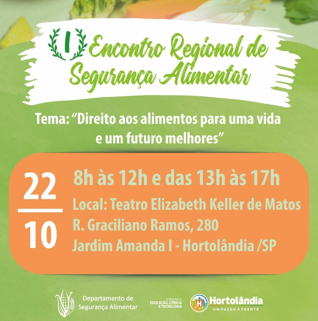 Para marcar o Dia Mundial da Alimentação, celebrado nesta terça-feira (16/10), Hortolândia promoverá, na terça-feira da próxima semana (22/10), o “1º Encontro Regional de Segurança Alimentar”. Organizado pela Prefeitura, por meio do Departamento de Segurança Alimentar da Secretaria de Educação, Ciência e Tecnologia, o evento gratuito abordará o tema “Direito aos alimentos para uma vida e um futuro melhores”. A programação ocorrerá, das 8h às 12h e das 13h às 17h, no Teatro Elizabeth Keller de Matos, localizado no Jardim Amanda I.