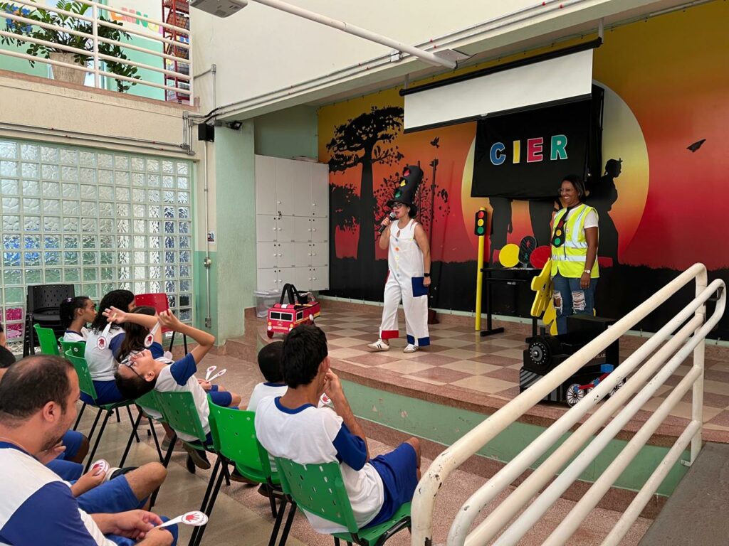 Na atividade, os agentes também fizeram uma apresentação teatral para ensinar aos estudantes de maneira lúdica e divertida a importância da segurança no trânsito. Um dos principais tópicos abordados é o gesto do pedestre para indicar aos motoristas que quer atravessar uma via na faixa de pedestres.