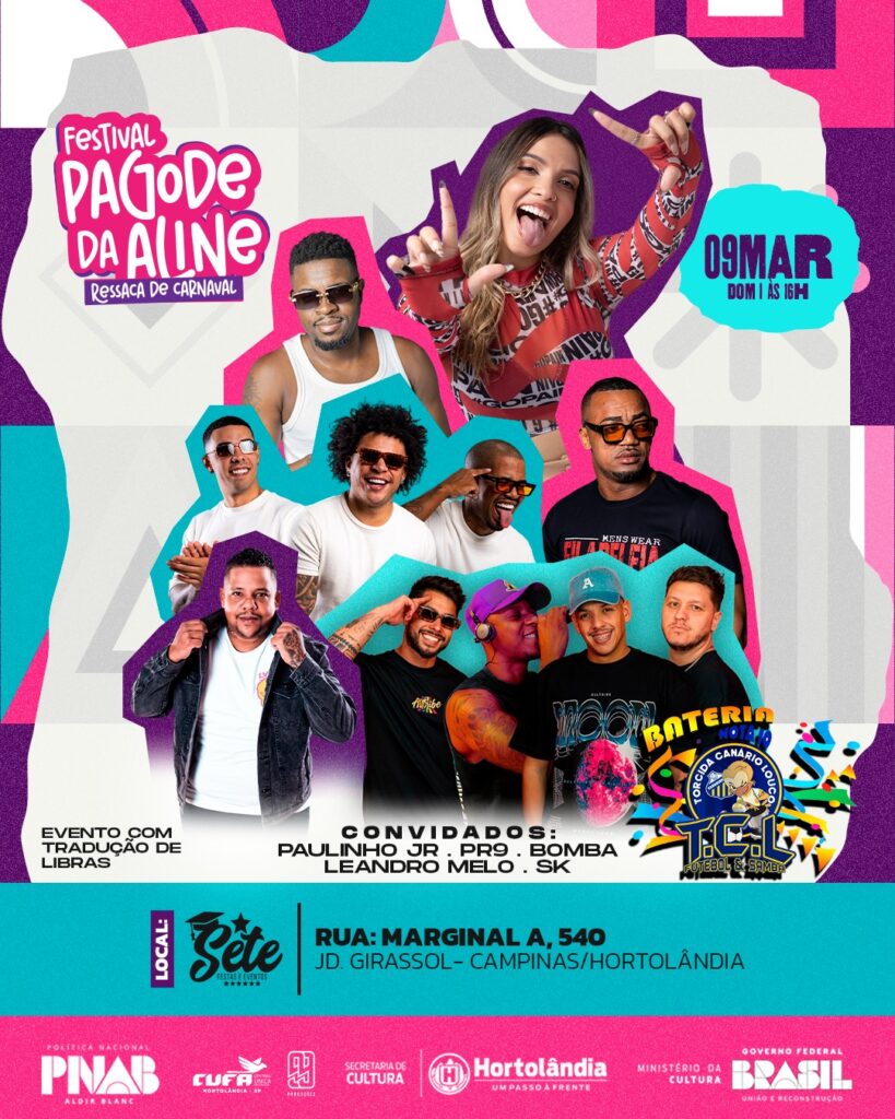 Também no domingo, para se despedir da folia carnavalesca em alto astral, acontece o Festival Pagode da Aline, comandado pela cantora e compositora Aline Bianchi.