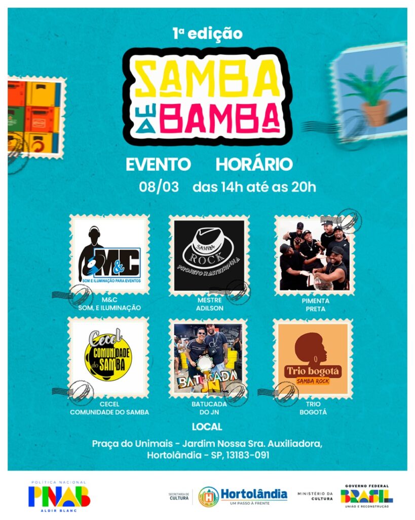 Quer diversão neste fim de semana? Então, se liga nas dicas de lazer da Prefeitura de Hortolândia. Três projetos culturais animam a cidade com arte e conhecimento. O projeto Samba de bamba acontece neste sábado (08/03), às 14h, na Praça do Unimais, no Jardim Nossa Senhora Auxiliadora. Já no domingo (09/03), tem o projeto Criança e natureza, às 15h, no parque socioambiental Irmã Dorothy Stang, localizado na rua Manoel Antonio da Silva, 415. Ainda no domingo, às 16h, acontece o Festival Pagode da Aline, no espaço Sete Festas e Eventos, que fica na Marginal A, 540, Jardim Girassol. Os três eventos foram contemplados pelo edital federal da PNAB (Política Nacional Aldir Blanc), divulgado no ano passado pela Prefeitura de Hortolândia.