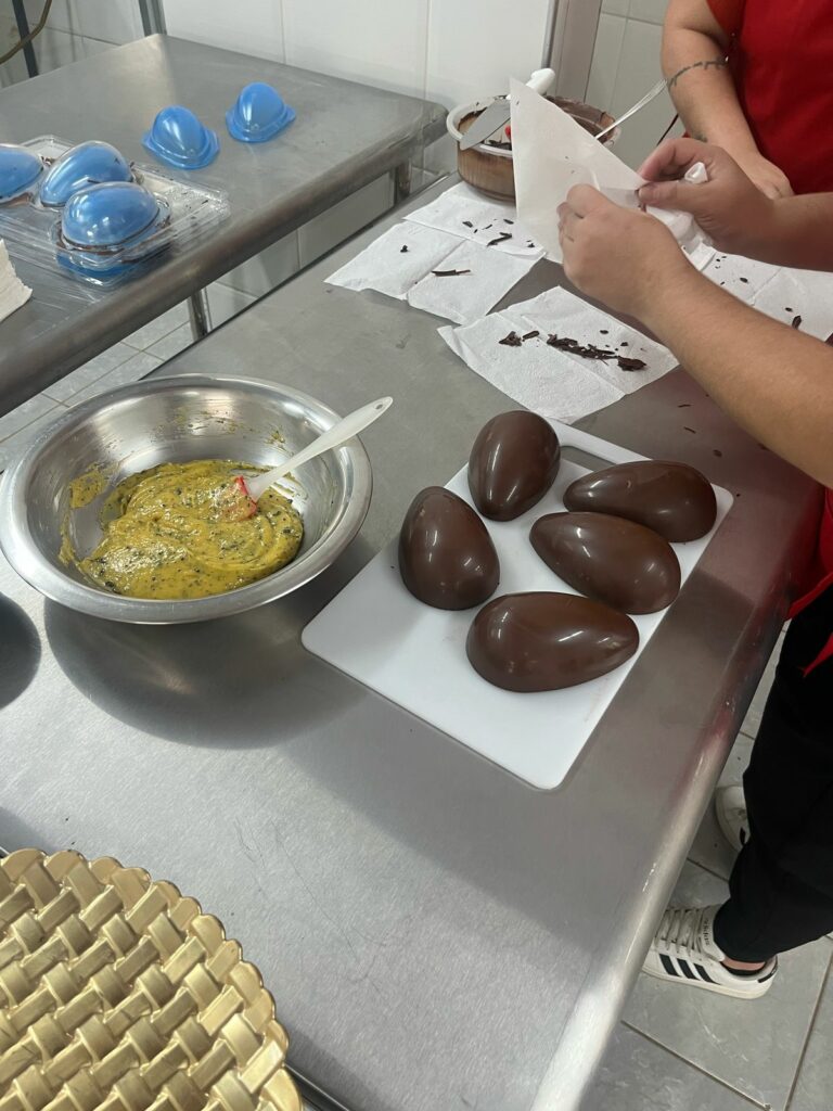 Durante a “oficina culinária de confecção de Ovos de Páscoa”, os participantes aprenderam técnicas para produzir chocolates artesanais, com potencial para gerar renda extra neste período. Ministrado pela confeiteira Tainam Carvalho, o curso teve duração de quatro horas e mesclou teoria e prática, abordando desde a escolha dos ingredientes até a finalização dos ovos recheados. Os aprendizes colocam a mão na massa e criaram suas próprias versões do produto, explorando diferentes sabores e decorações.