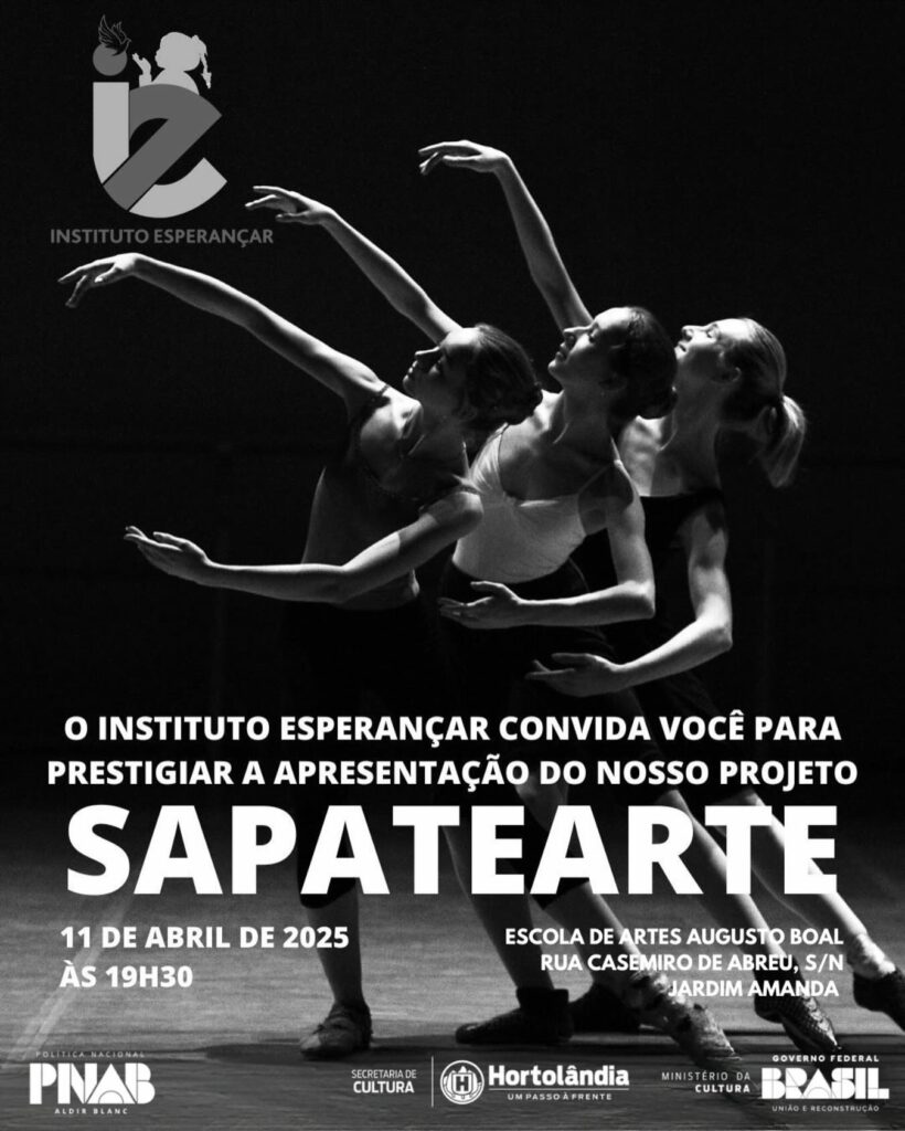 Emoção por meio da arte do sapateado. É com essa proposta que o Instituto Esperançar promove o espetáculo “Sapatearte”. O evento será nesta sexta-feira (11/04), às 19h30, na Escola de Artes Augusto Boal, que fica na rua Casemiro de Abreu, s/nº, Jardim Amanda.