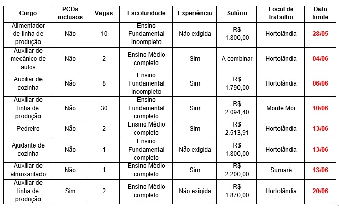 Dentre as oportunidades divulgadas pelo órgão da Prefeitura, destaques são 32 vagas para auxiliar de linha de produção, das quais duas vagas são abertas também para PCDs