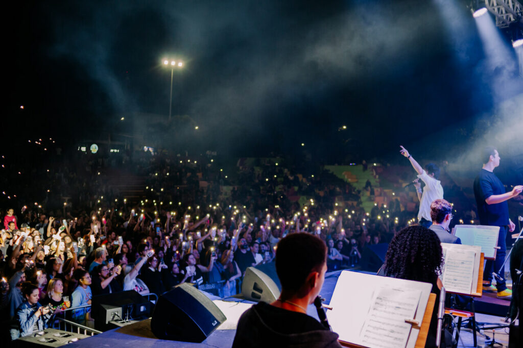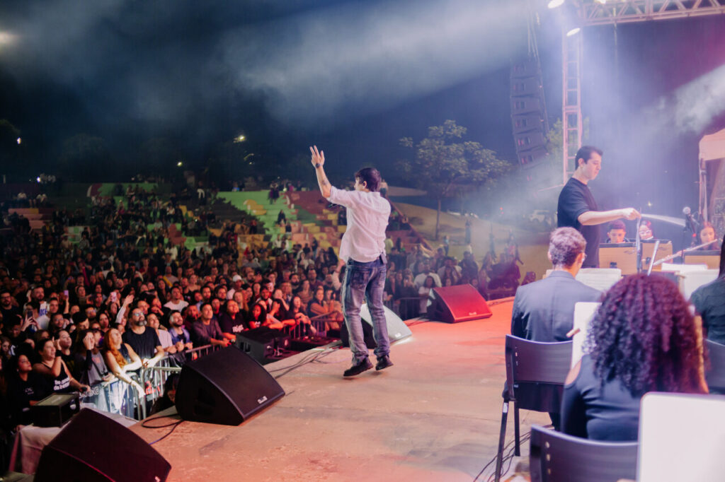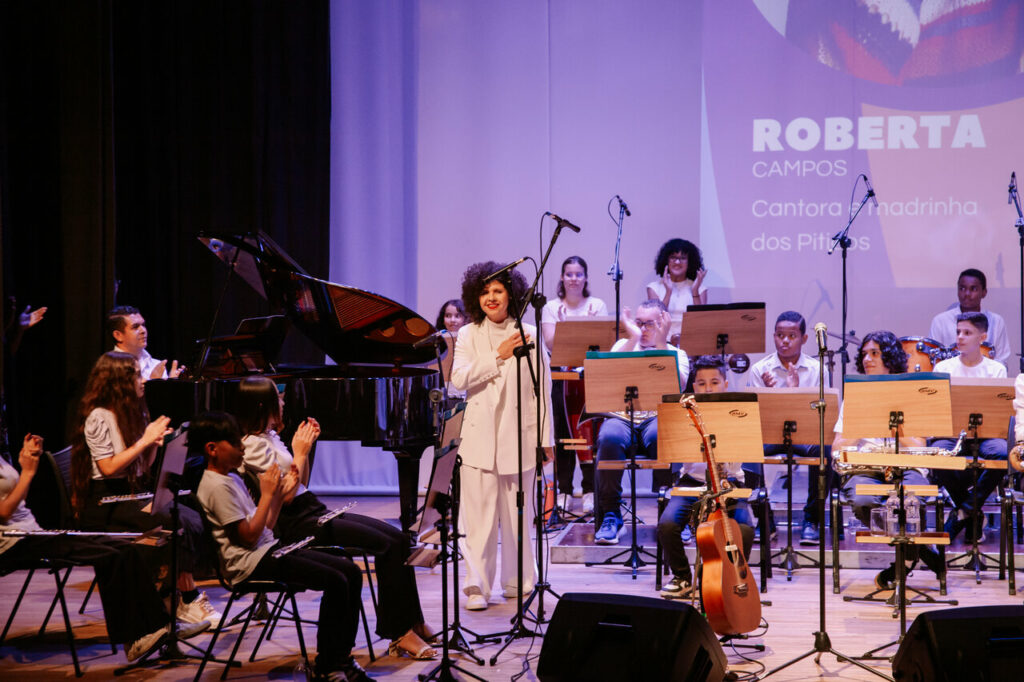 Depois, veio o grande momento esperado da noite. Roberta Campos subiu ao palco para se unir aos “piticos”. Juntos, eles apresentaram três músicas da cantora: “De janeiro a janeiro”, “Gérbera” e “Minha felicidade”.