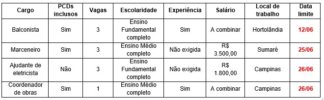 Comércio, marcenaria, serviços e construção civil. Hortolândia tem oportunidades profissionais nessas áreas. O PAT (Posto de Atendimento ao Trabalhador), órgão da Prefeitura, divulga 10 vagas de emprego. Os destaques são para balconista, marceneiro e ajudante de eletricista, sendo três vagas disponíveis para um desses cargos. Há também uma vaga para a função de coordenador de obras. PCDs (pessoas com deficiência) também podem concorrer às vagas de balconista, marceneiro e coordenador de obras.