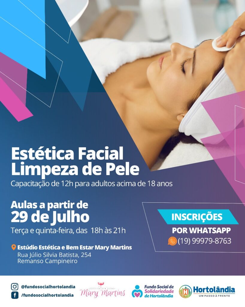 Há 10 vagas disponíveis. Podem se inscrever, até 23 de julho, moradores da cidade, com 18 anos ou mais e Ensino Médio completo. Segundo os organizadores, o objetivo é oferecer a quem deseja ingressar na área da beleza e começar uma nova etapa profissional capacitação gratuita em Limpeza de Pele. Interessados podem se inscrever por meio deste link ou pelo WhatsApp (19) 99979-8763.