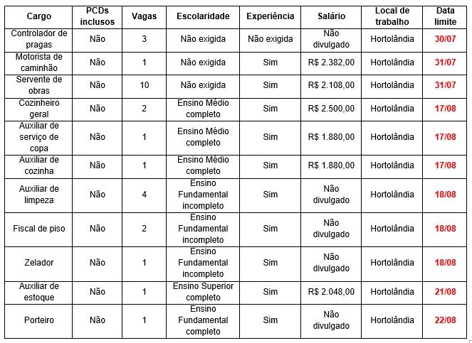 Confira no quadro abaixo os requisitos, valor dos salários, local de trabalho e data limite das 27 vagas de emprego divulgadas pelo PAT de Hortolândia: