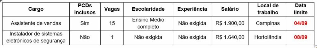 Confira abaixo os requisitos, valores dos salários, locais de trabalho e as datas limites das 16 vagas de emprego divulgadas pelo PAT de Hortolândia:
