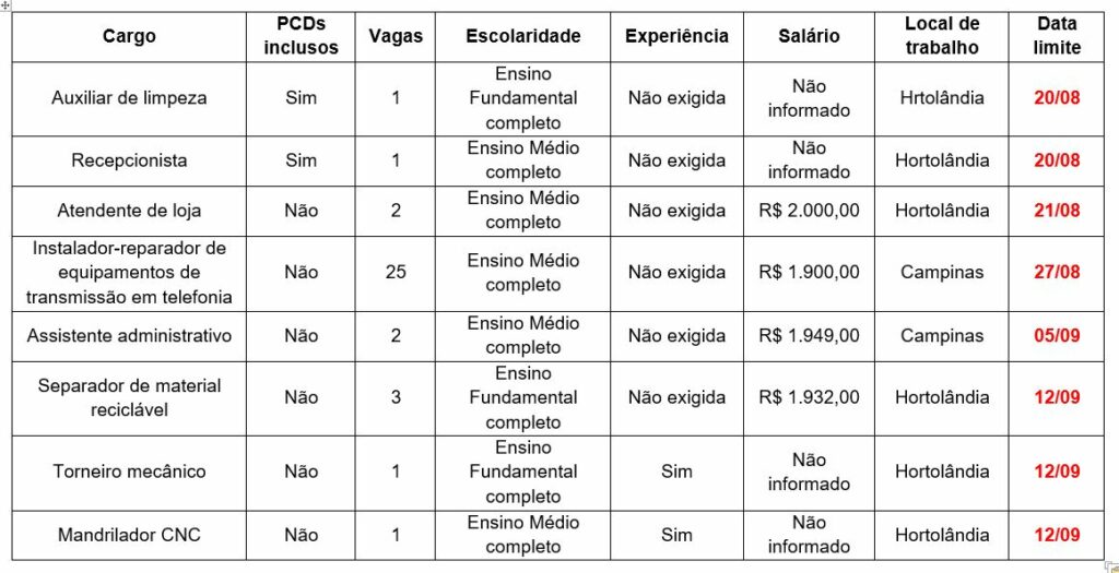 Você quer atuar no setor de telefonia? Então, se liga que o PAT (Posto de Atendimento ao Trabalhador), órgão da Prefeitura de Hortolândia, tem vagas de emprego nessa área. São um total de 36 vagas oferecidas, destas 25 são para instalador-reparador de equipamentos de transmissão em telefonia. PCDs também devem ficar atentos! Tem oportunidades de trabalho para vocês! São para auxiliar de limpeza (uma vaga) e recepcionista (uma vaga). Há ainda vagas para outros cargos (veja quadro abaixo).