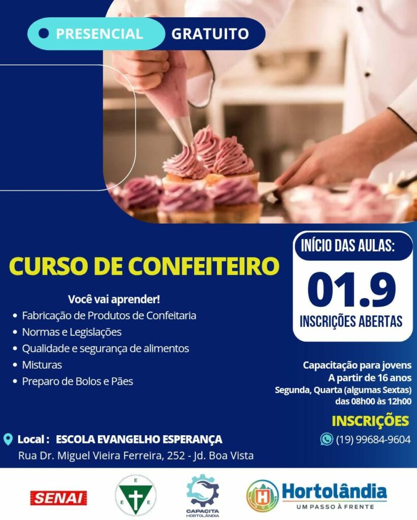 A Prefeitura abriu inscrições para dois cursos profissionalizantes gratuitos, na área da gastronomia, que serão ofertados pelo Programa “Capacita Hortolândia”, neste segundo semestre. São os cursos de “Padeiro” e “Confeiteiro”, que serão ministrados pela equipe do Senai (Serviço Nacional de Aprendizagem Industrial), em duas entidades parceiras (veja abaixo).