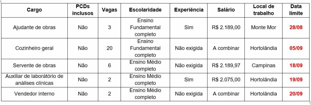 Confira abaixo os requisitos, valores dos salários, locais de trabalho e as datas limites das 33 vagas de emprego divulgadas pelo PAT de Hortolândia: