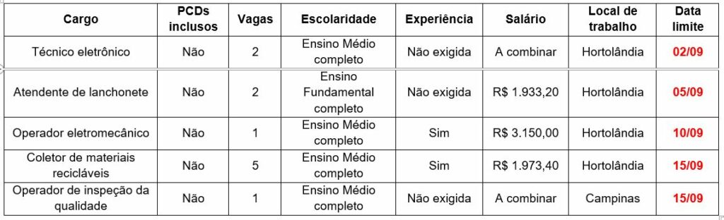 Confira abaixo os requisitos, valores dos salários, locais de trabalho e as datas limites das 11 vagas de emprego divulgadas pelo PAT de Hortolândia: