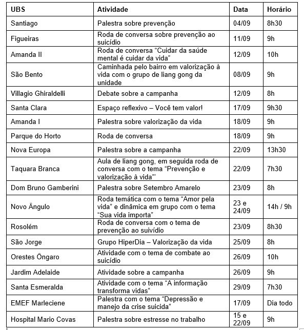 A primeira será na EMEF (Escola Municipal de Ensino Fundamental) Professora Marleciene Priscila Presta Bonfim, no dia 17/09. Ao longo do dia será ministrada a palestra com o tema “Depressão e manejo da crise suicida”.