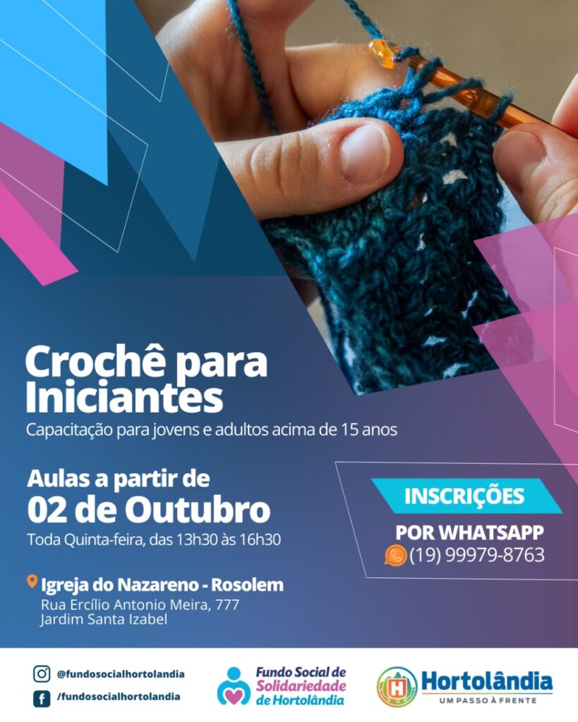 Estão abertas as inscrições para mais duas formações gratuitas, que serão promovidas pelo FunSol (Fundo Social de Solidariedade) de Hortolândia, a partir de outubro, em regime de parceria com a iniciativa privada. São elas: o “Curso de Crochê para Iniciantes” e o “Curso de Assistente Financeiro”.