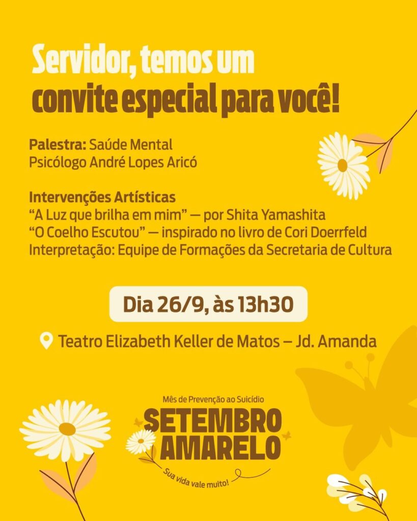 Se você é servidor da Prefeitura, atenção a esta mensagem. Nesta sexta-feira (26/09), haverá mais uma ação do “Setembro Amarelo”, Mês de Prevenção ao Suicídio, organizada pela Administração Municipal e voltada ao funcionalismo público. A ação acontecerá no Teatro Elizabeth Keller de Matos, localizado na Unidade Cultural Arlindo Zadi, na Rua Graciliano Ramos, 280, no Jardim Amanda.