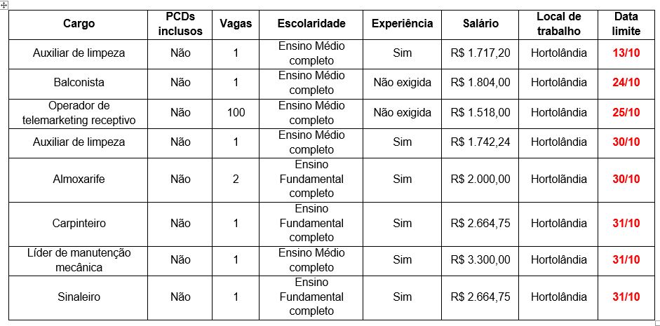 Confira abaixo os requisitos, valores dos salários, locais de trabalho e as datas limites das 108 vagas de emprego divulgadas pelo PAT de Hortolândia: