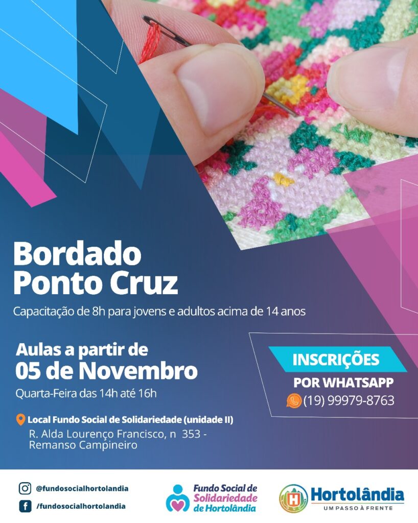 Já estão abertas as inscrições para o “Curso de Bordado em Ponto Cruz”, que será promovido gratuitamente pelo FunSol (Fundo Social de Solidariedade), durante quatro quartas-feiras de novembro. A formação, de 8 horas/aula, é voltada a moradores de Hortolândia, adultos e jovens, maiores de 14 anos.