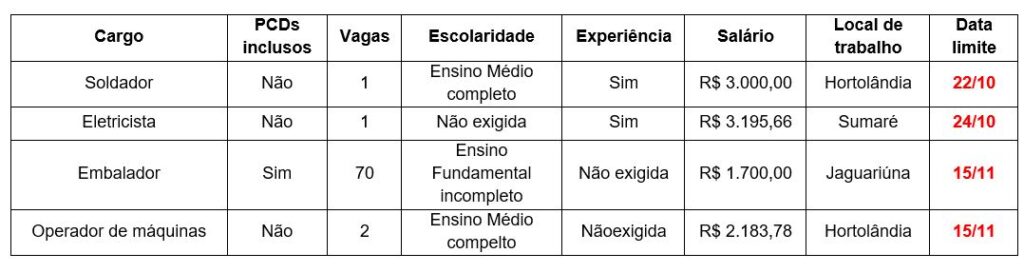 Confira abaixo os requisitos, valores dos salários, locais de trabalho e as datas limites das 74 vagas de emprego divulgadas pelo PAT de Hortolândia: