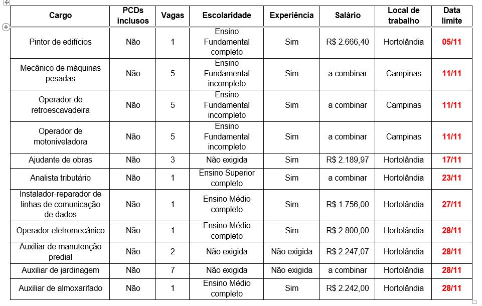Confira abaixo os requisitos, valores dos salários, locais de trabalho e as datas limites das 32 vagas de emprego divulgadas pelo PAT de Hortolândia:
