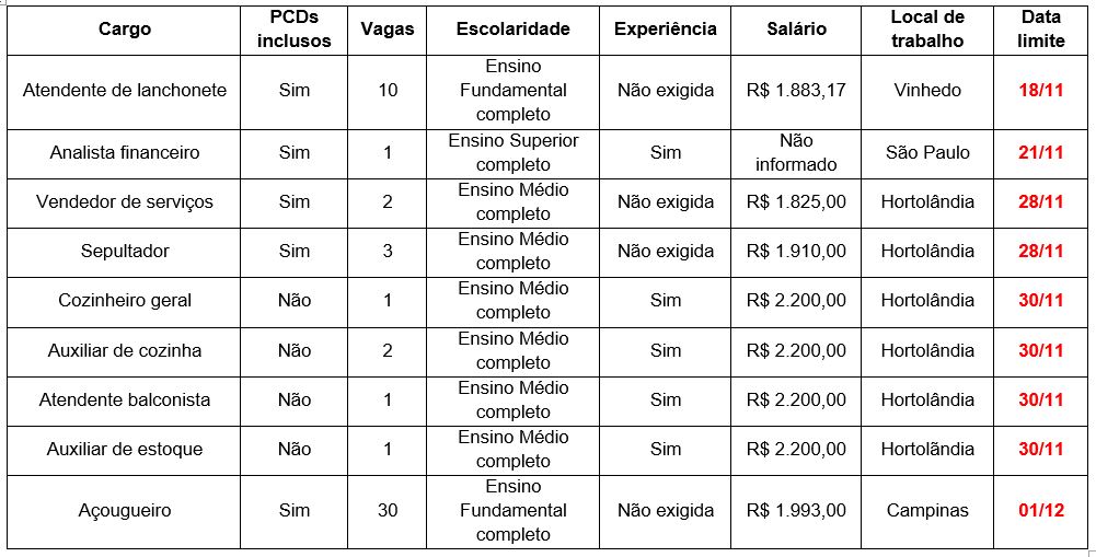 Confira abaixo os requisitos, valores dos salários, locais de trabalho e as datas limites das 51 vagas de emprego divulgadas pelo PAT de Hortolândia: