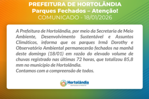 A Prefeitura de Hortolândia, por meio da Secretaria de Meio Ambiente, Desenvolvimento Sustentável e Assuntos Climáticos, informa que, por questão de segurança, os parques Irmã…