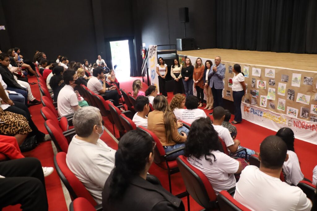 “Ele melhorou muito o comportamento!” Com essas palavras encorajadoras, a dona de casa Selma Francisca Henrique Silva, moradora do Jardim Amanda, fala com afeto de seu filho, N., de 13 anos, que tem Transtorno do Espectro Autista (TEA). N. é um dos pacientes atendidos pelo Centro de Convivência Incluir, unidade especializada da Secretaria de Saúde, da Prefeitura de Hortolândia. O jovem é um dos pacientes que participaram do evento “Levando música – Conectando vidas”, promovido pela Prefeitura, no Teatro Elizabeth Keller de Matos, Jardim Amanda, na manhã desta terça-feira (13/05). O evento teve apresentações artísticas com pacientes atendidos pela Prefeitura em vários serviços de Saúde Mental, tais como CAPs (Centros de Atenção Psicossocial), CIERS (Centros Integrados de Educação e Reabilitação), dentre outros. O evento lembra o Dia Nacional da Luta Antimanicomial, neste domingo (18/05), e faz parte da programação de 34 anos de emancipação política de Hortolândia. Também participaram do evento o prefeito José Nazareno Zezé Gomes e a secretária adjunta de Saúde, Jennifer Bazílio.